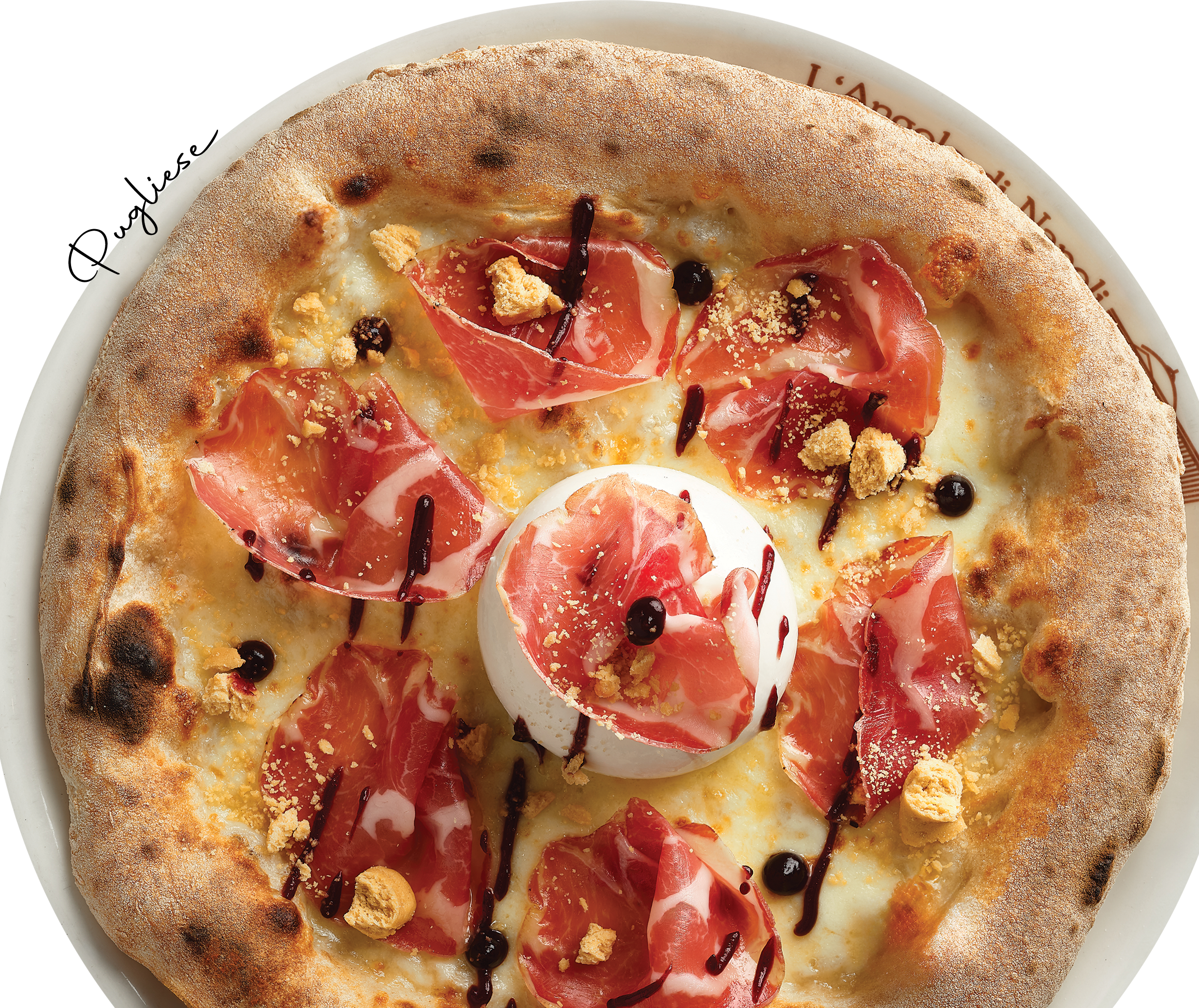 Pomodoro pelato alta qualità, mozzarella fiordilatte di Agerola, pancetta di maiale di Parma del Podere Cadassa, fette di patate Bologna arrosto, ricotta di bufala D.O.P.